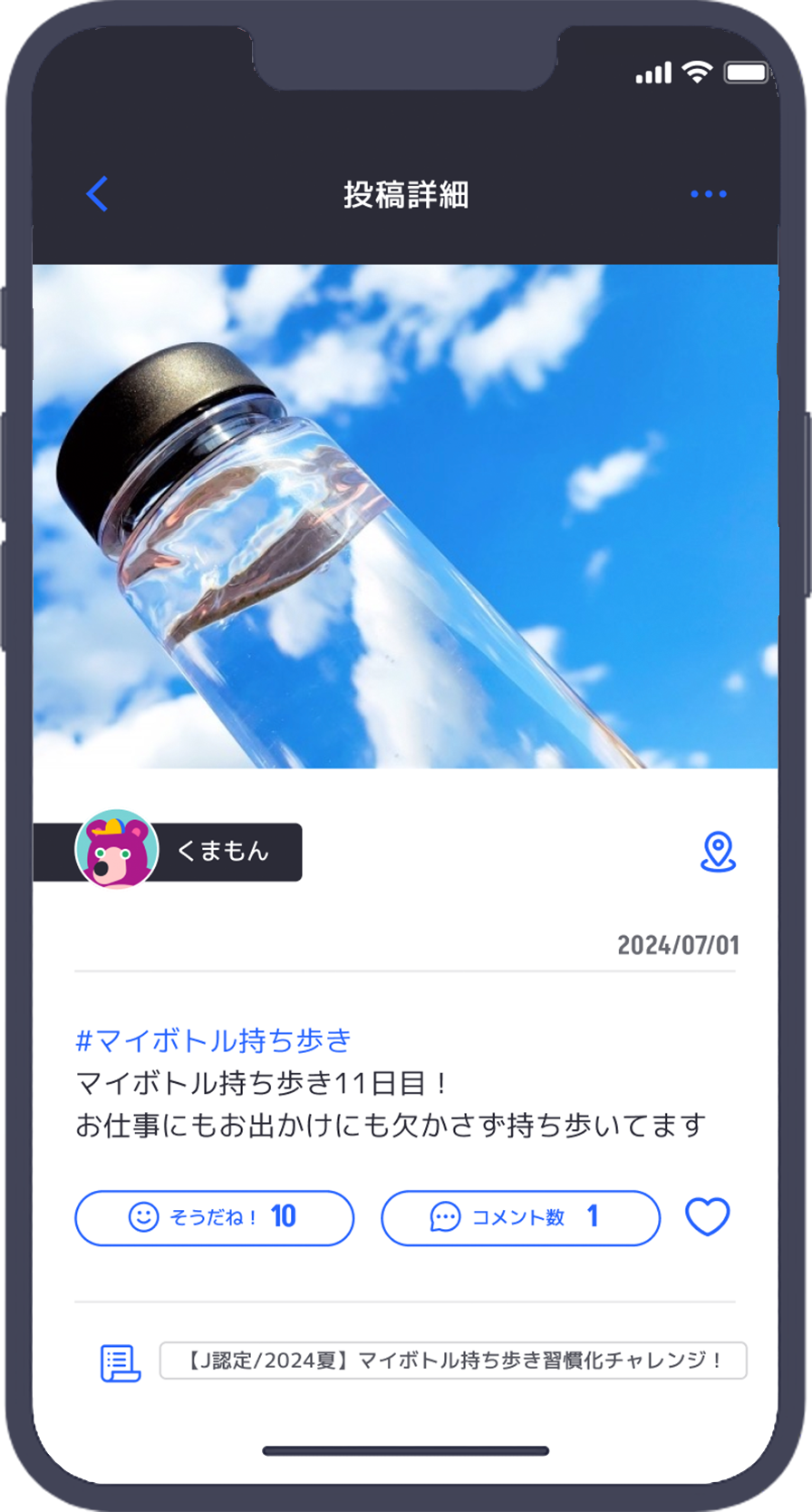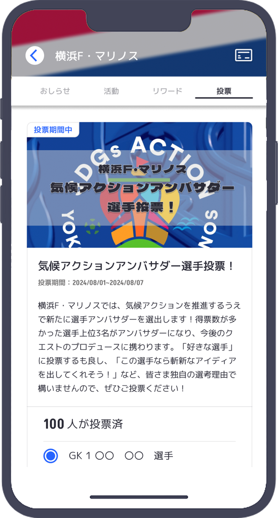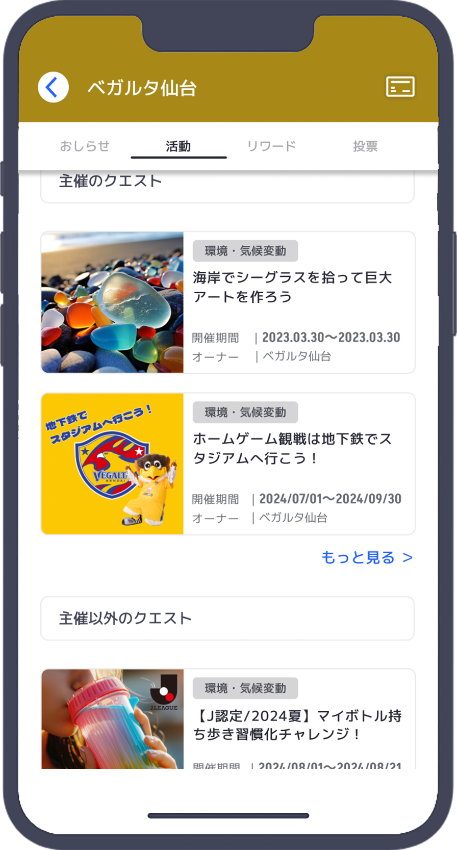 クエスト一覧から、クラブの気候アクションクエストや、Jリーグ&NTTグループの習慣化認定クエストを見つけて参加しよう。