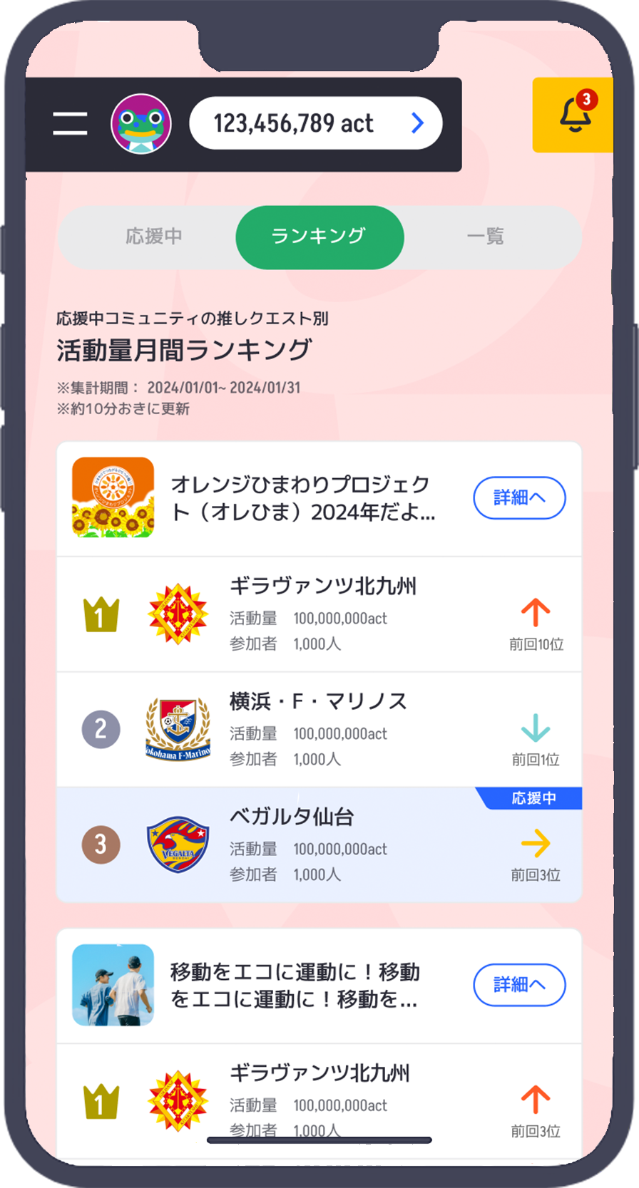 クエストテーマに合った投稿をして、ポイントと活動量を獲得しよう。ポイントをためるとメンバーシップランクが上がります。獲得した活動量は応援クラブごとに集計されて、クラブのランキングなどに影響します。